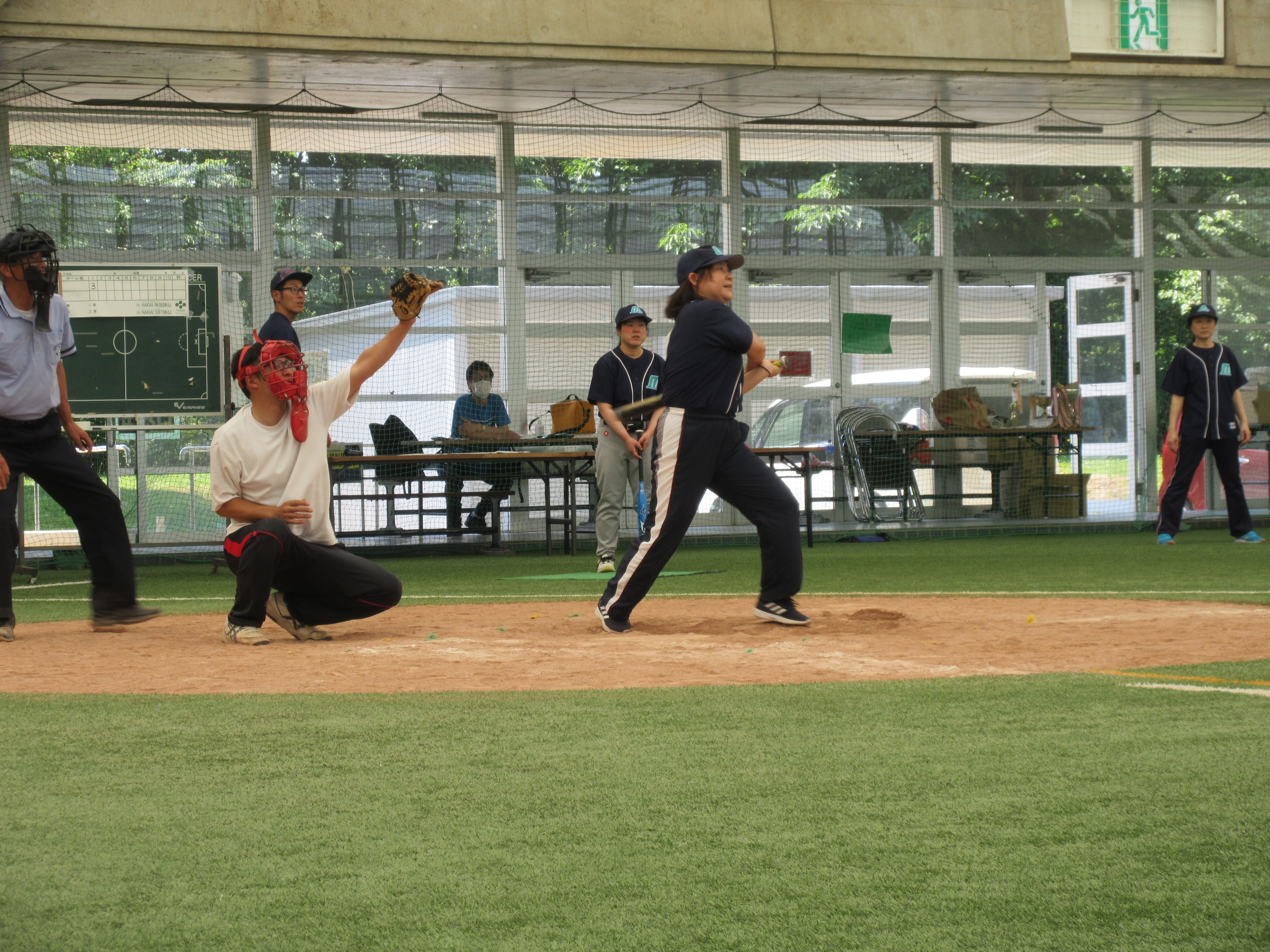 Ю 高めのボールをフルスイング。職員だって真剣勝負です。