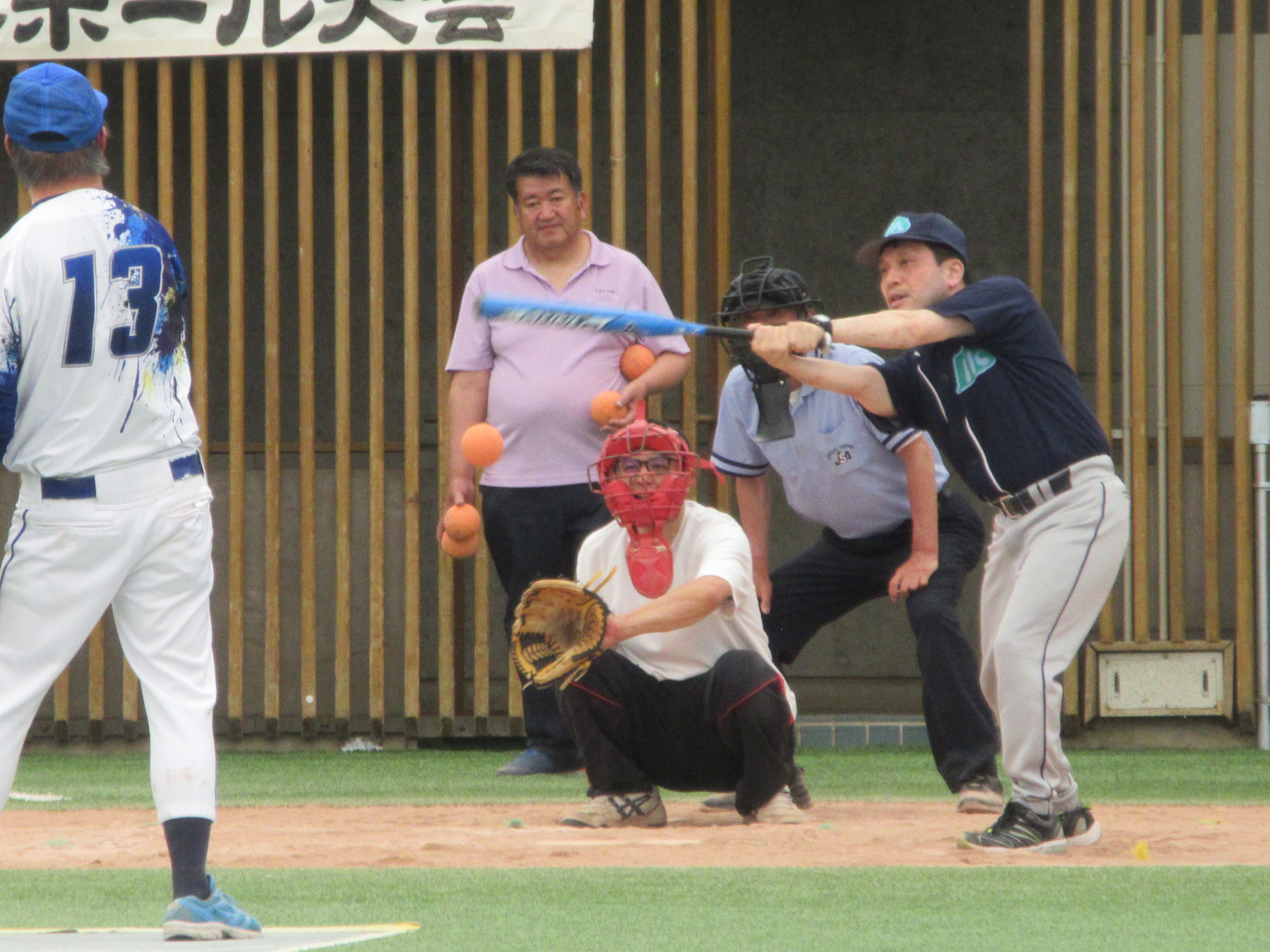 Ю まずは、新生園保護者の審判員の佐藤さん。風格漂わせる構えのポーズ。