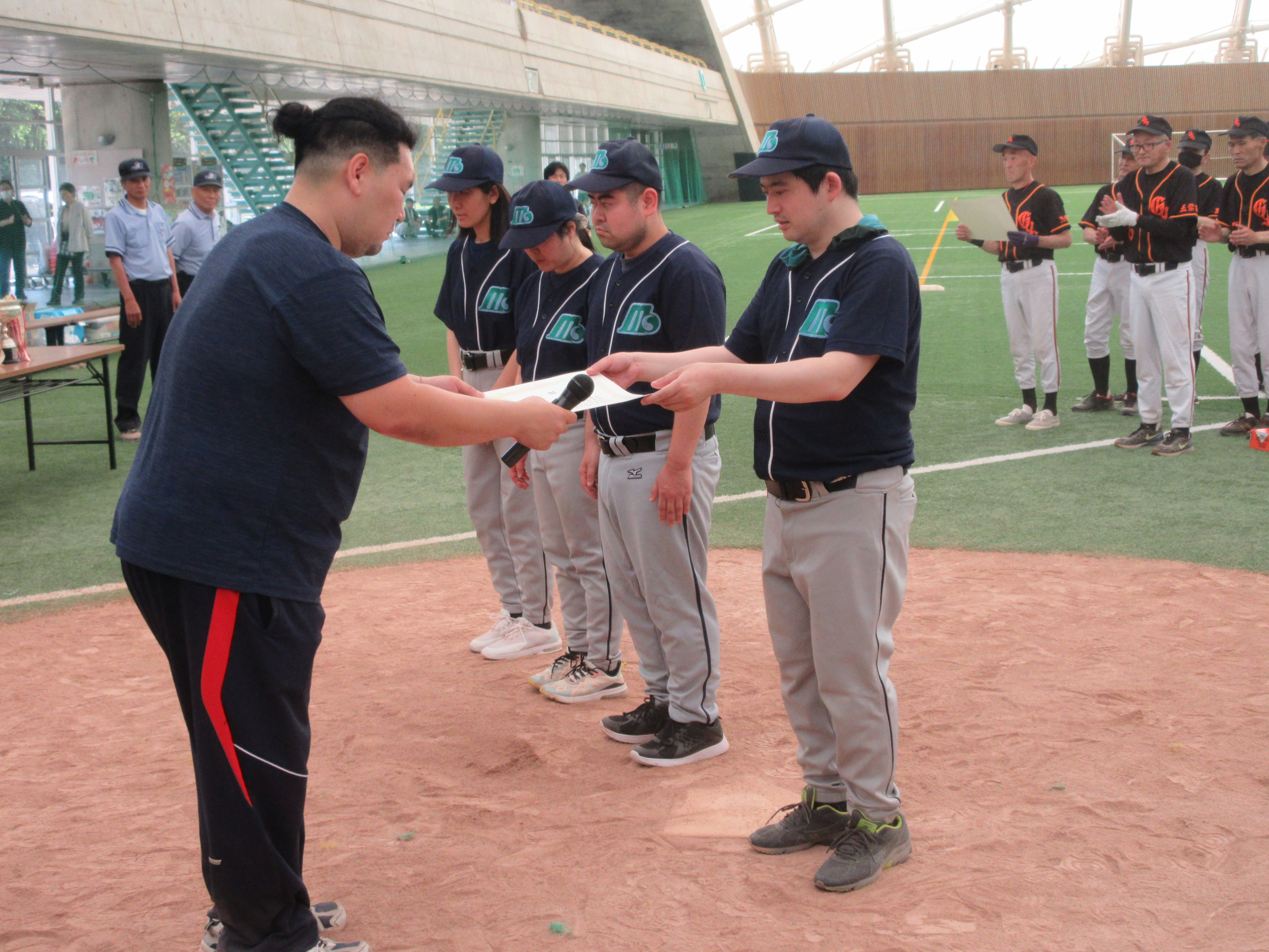 全国のHPをご覧になっている皆様、大変ご無沙汰をしておりました。変わりなくお元気で過ごしていたでしょうか。水林新生園の利用者・職員共々元気でおります。ご安心ください。 さて、表題にありますようにこの度、『中央地区施設利用者交流ソフトボール大会』が6月13日(木)秋田市雄和にあります「あきたスカイドーム」で行われました。3チームでのリーグ戦を行い、健闘したものの残念ながら3位という結果でした。初戦の対ひまわり苑戦では、初回立ち上がりの失点もあり、4回には同点に追いつくものの、逆転することはできずに5-5の引き分けジャンケン勝負となりました。ジャンケン5人勝負は、一人目・二人目と負け、後がなくなったところで三人目・四人目と勝ち、勝負は最終五人目となりました。結果、惜しくも破れて敗戦となりました。続く試合の対戦相手は優勝候補の玉葉荘ということもあり、落とせない試合であったので近年になくとても残念でした。そして対玉葉戦は、昼食を挟み午後から行われました。過去の対戦においては、大量得点差でのゲームでした。試合前の円陣で気合いを注入、いざ勝負へと向かいました。新生園の先攻でゲームが始まり、いきなりの2点先取、相手チームの動揺が手に取るように現れました。そして、ゲームの流れが新生園に傾いたままその裏の守備につきました。相手に流れを渡さない懸命な守備もあり、2点にとどめて2回以降の攻防に突入しました。相手の強力打線をミラクルな守備で封じ、お互いに一歩も譲らず無得点のまま5回を終了。1試合目のジャンケン負け試合が脳裏をグルグルと回りました。そうしたところ、大会競技本部よりお知らせがあり、近年にない好ゲームをジャンケンで終わらせるには忍びないということで、延長戦へと突入することとなりました。そして運命の6回、我がチームは得点することはできず、相手チームに失点を許しサヨナラ負けとなりました。 朝早くから夕方までの日程で、他施設利用者も含め全員怪我も事故もなく楽しく終えることができ、そして、来年の開催を約束し笑顔で「あきたスカイドーム」を後にすることができました。それでは、恒例となりましたスライドショーのスイッチをONしましょう。